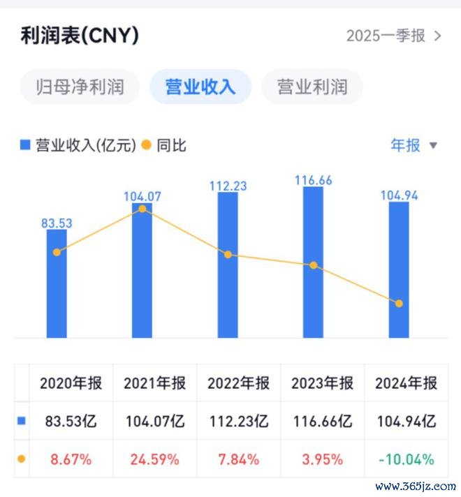 2024年,公司实现营业收入104.94亿元,同比下降10.04%,为近五年来首次下滑;归母净利润13.71亿元,同比增长8.69%。