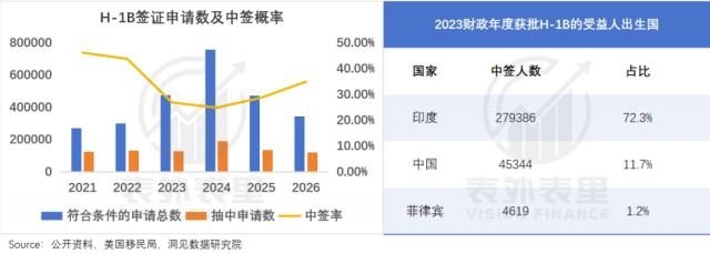 "但 H-1B 就是最大的不确定。"莉莉说,虽然每年抽一次,但抽中概率只有 1/3。叠上"中国人"的 debuff,更是遥遥无期:2023 财年获批 H1-B 的人里,中国人仅占比 11.7%,印度却有 72.3%,是中国人的 6.2 倍。
