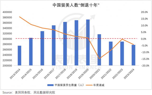 据美国国务院数据,截至今年 3 月,中国学生签证数量同比大跌 42.5%,一年之内几乎腰斩;把时间拉长看,在美中国留学生数量,已跌回 10 年前的水平。