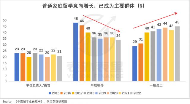 想要通过留学打翻身仗的家庭不在少数,数据显示,父母职业背景为"一般员工"的留学生比例增长明显,留学逐渐走向大众。