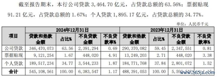 从贷款分类来看,占该行总贷款约60%的公司贷款不良率在2024年虽得到一定控制,但 “票据贴现”的不良贷款率极高,达到4.91%,这部分贷款金额为91.21亿元,占贷款总额的1.67%。